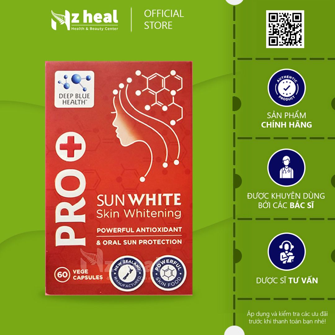 Deep Blue Health Pro Sun White là sự lựa chọn hợp lý từ 100% thành phần thiên nhiên làm cho nó trở thành một nguồn thực phẩm mạnh mẽ cho da. Viên chống nắng Pro SunWhite làm sáng da toàn thân, đồng thời hỗ trợ làm giảm vết vết nám, hỗ trợ tăng cường khả năng tự bảo vệ của da dưới ánh nắng mặt trời, cho làn sóng da không chống nắng. Ngoài ra, sản phẩm còn tiêu diệt 20% gốc tự làm, tăng cường đề kháng cho da nhờ sự kết hợp hoàn hảo của chiết xuất Dương sên và Hạt cầm đỏ.