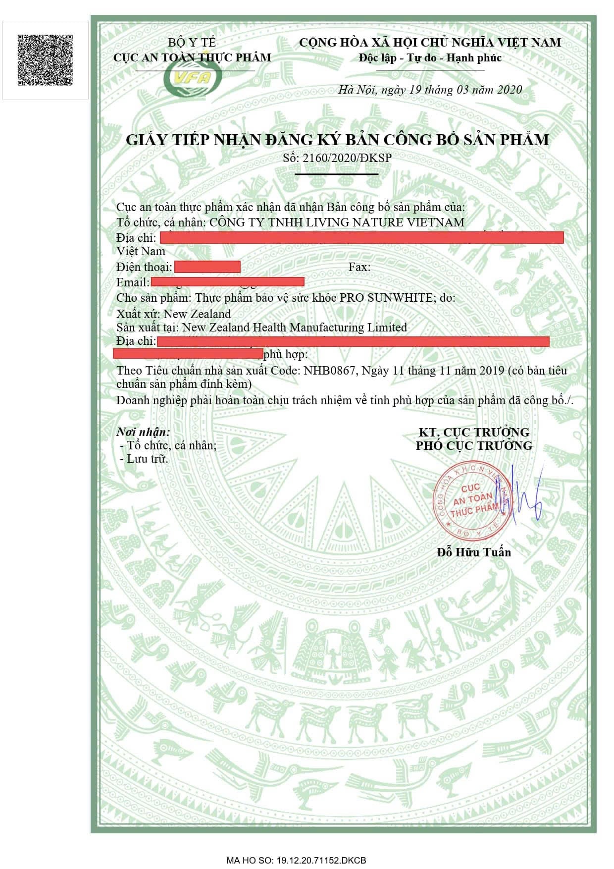 Thương nhân nhập khẩu và phân phối: CÔNG TY ĐỊNH CƯ LIVING NATURE VIỆT NAM
